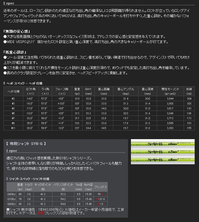 – Larger/ wide head construction for forgiveness across the face. – Shallow design with low CG to assist in high launch. – Slightly rounded sole deisign for great flow across any surface. – Each club has optimal face angle for its intended purpose. (3wd = .5*open to 11wd = 2* closed) – Balanced weighting across the head for control and workability. The W422V fairway Wood comes standard with a high modulus SYB G Series carbon shaft. It is strong against deformation during high speeds and produces a mid trajectory. It is available in 66, 76, or 86 gram models. Please contact us using the above navigation for quotes on custom builds/ upgrades.